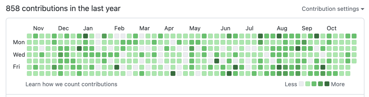 42週もなんとかフルコンプ。Hacktoberfestは+1で3件。ようやくバグ修正のプルリクを出せた。