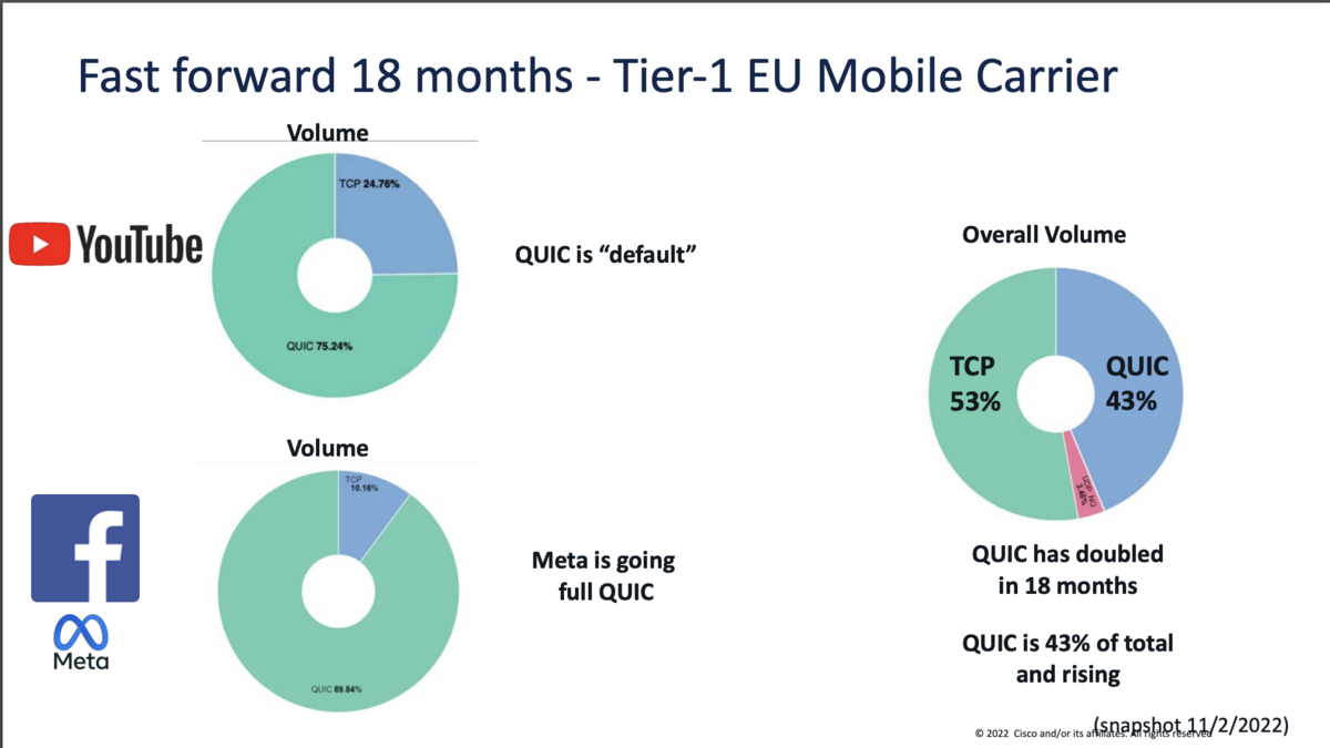 The transition of network traffic from TCP to QUIC is happening extremely fast with measurements across the world showing QUIC has already reached nearly 50% of total traffic, doubling approximat...