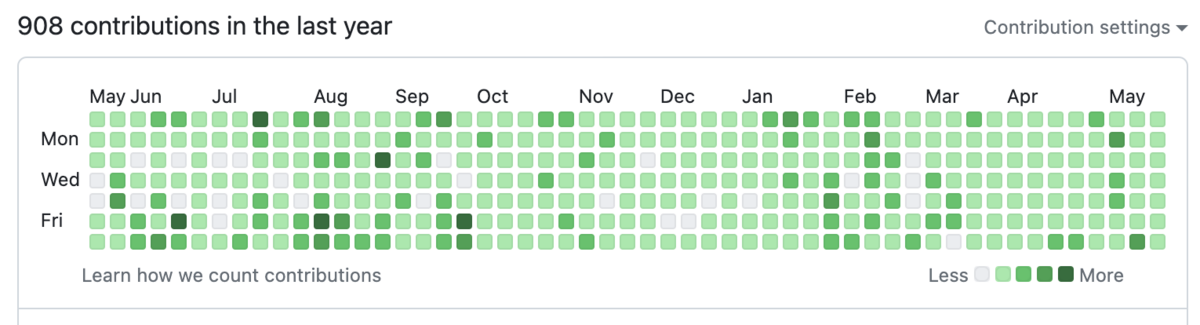 Rust By Exampleの翻訳を中心に継続中。年間コントリビューション数は900を維持できている。4桁は遠い...。