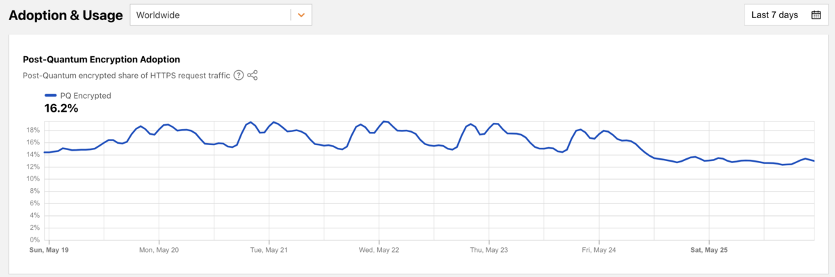 平日は20%近くまで耐量子暗号で暗号化されたトラフィックがある模様。4月末時点では、↓のブログにも書いた通り13%程度だった。1ヶ月でさらに利用が増えている模様。